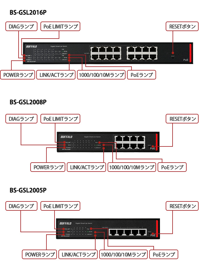 最大供給電力:60W(BS-GSL2005P、BS-GSL2008P)、120W(BS-GSL2016P)