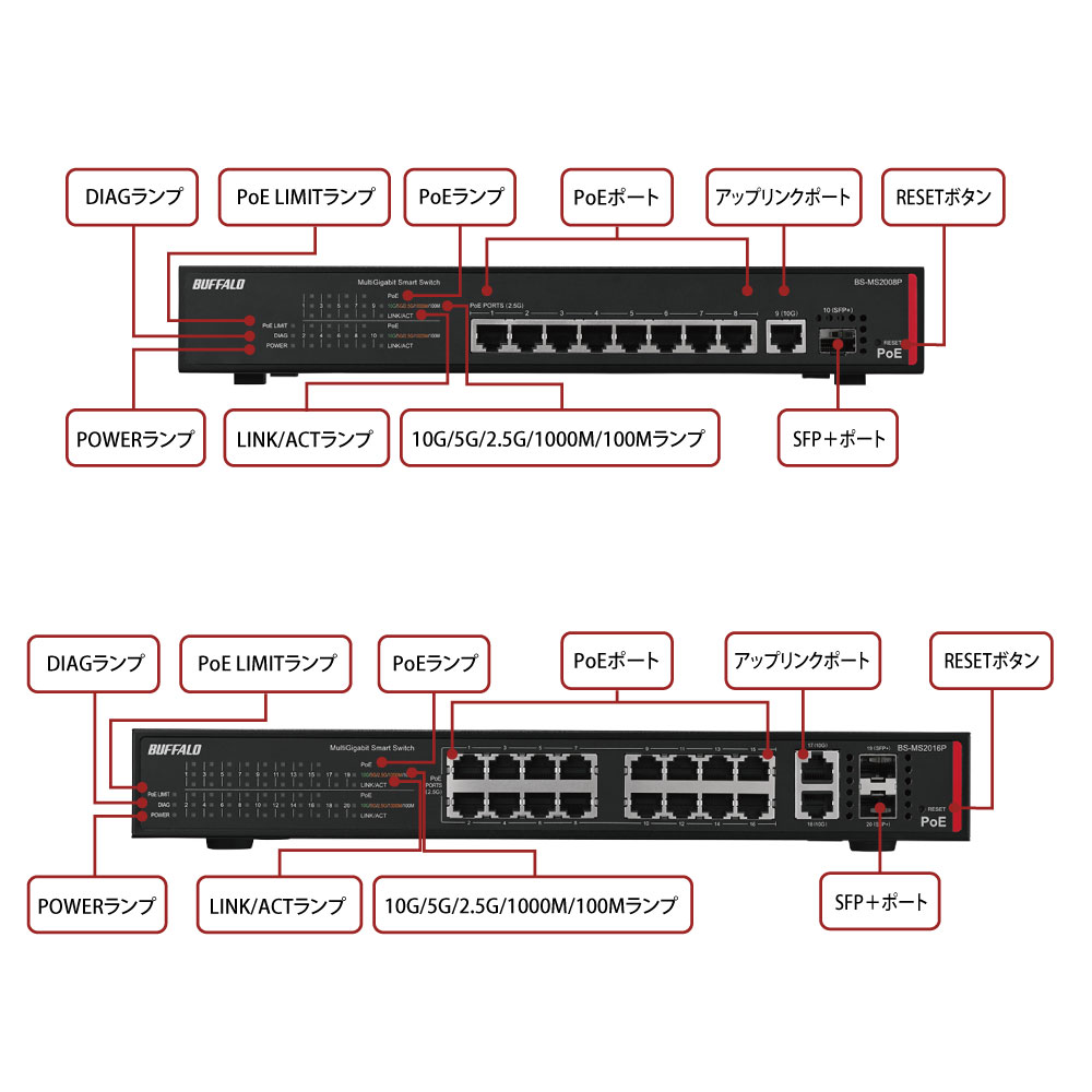 | ポート数 | BS-MS2016P:100/1000M/2.5G 16ポート(全ポートAuto-MDIX機能搭載)+100/1000M/2.5G/5G/10G 2ポート+[SFP+]2ポート BS-MS2008P:100/1000M/2.5G 8ポート(全ポートAuto-MDIX機能搭載)+100/1000M/2.5G/5G/10G 1ポート+[SFP+]1ポート |
