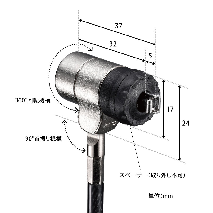 | 外形寸法 | ロック部 長さ 約37mm×径 約17mm(ワイヤーは除く※1)フック奥行 約5mm ワイヤー 長さ 約2000mm×径 約4.4mm ※1 ワイヤー接続部を含めると径17mm+7mm |