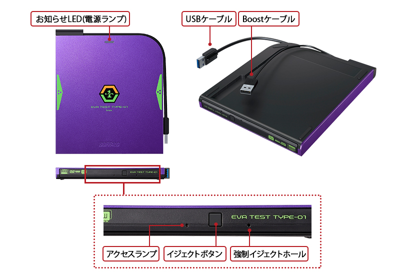 本商品は、必要なときにさっと接続して使えるポータブルDVDドライブです。USBケーブル1本をパソコンにつなぐだけで手軽にご利用いただけます。本商品ではさらに、バッファロー独自のパソコンのUSBポートからのバスパワー(電力供給)が不足した際に発生していたDVDドライブの不安定な動作を解消するための二つの機能を搭載。 電力不足を光で伝える「お知らせLED」と電力不足を専用のケーブルで補える「Boost(ブースト)ケーブル」の搭載で、今までACアダプターがないと使用できなかったパソコンでもDVDドライブの使用が可能になりました。
