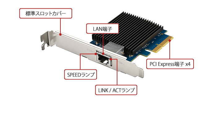 10GbE対応のNASや法人様向けスイッチの導入に合わせ、10Giga化を企業内に進めるのに最適なマルチギガ対応LANボードです。従来の1,000Mbps対応LANボードで通信した場合と比べ、10倍の高速化を実現します。(理論値)