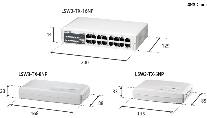 | 外形寸法(幅×高さ×奥行) | LSW3-TX-16NP:200×44×129mm LSW3-TX-5NP:135×33×85mm LSW3-TX-8NP:168×33×88mm ※本体のみ(突起部除く) |