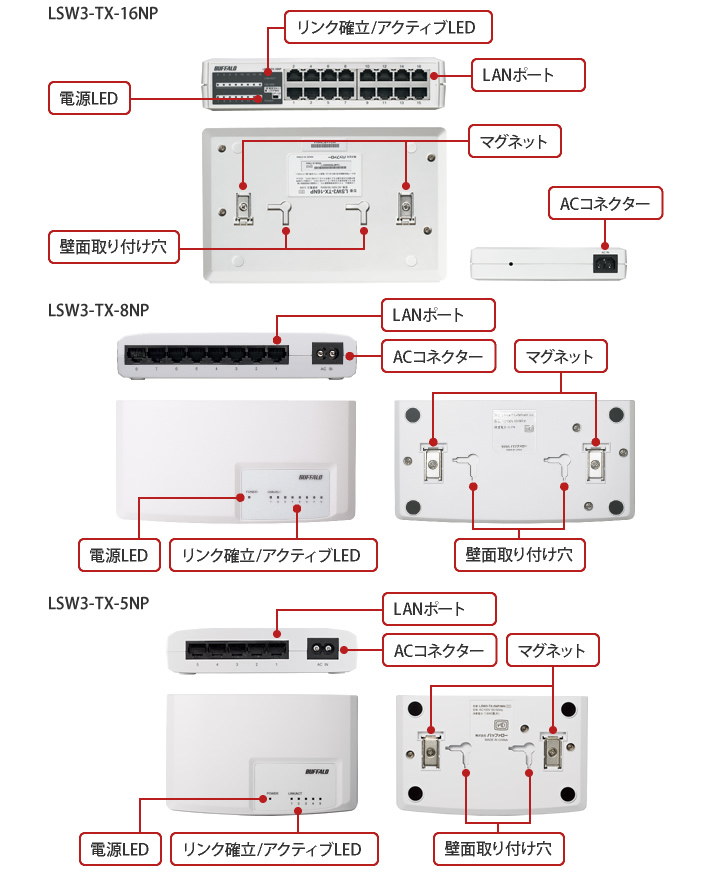 | 主な付属品 | 取扱説明書、電源ケーブル、マグネット、ゴム足、電源ケーブル抜け防止バンド※1 ※保証書は取扱説明書に記載 ※1 16ポートモデルのみ |