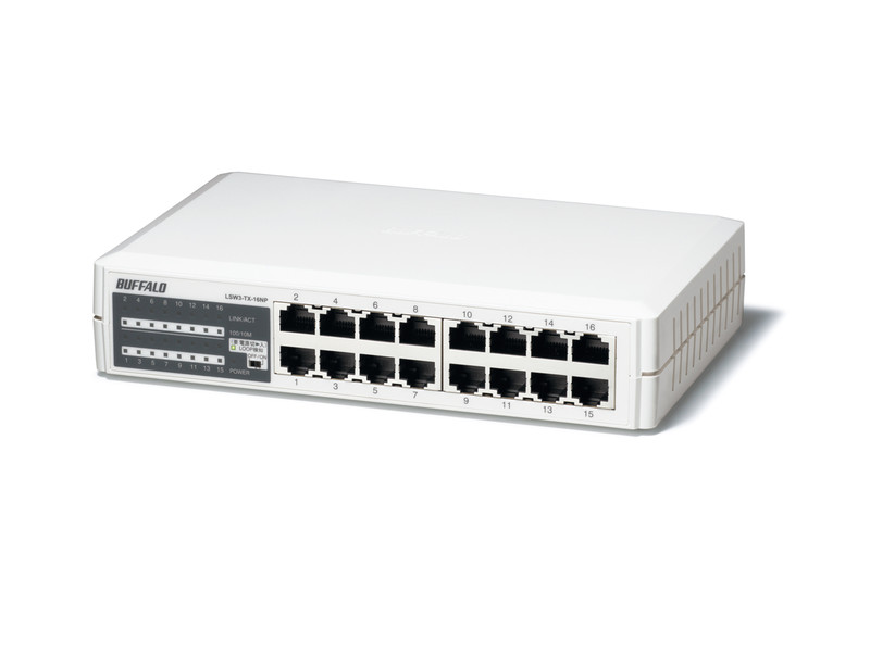 | サポート機能 | Auto-Negotiation (10/100,Full/Half-Duplex)機能、Auto-MDIX機能、IEEE802.3x フローコントロール、バックプレッシャー機能サポート、不良パケットフィルタリング機能、ループ検出機能※、おまかせ節電機能[リンク・ケーブル長]、EAPOL(IEEE802.1X)フレーム透過、BPDUフレーム透過 ※LSW3-TX-16NPのみ |