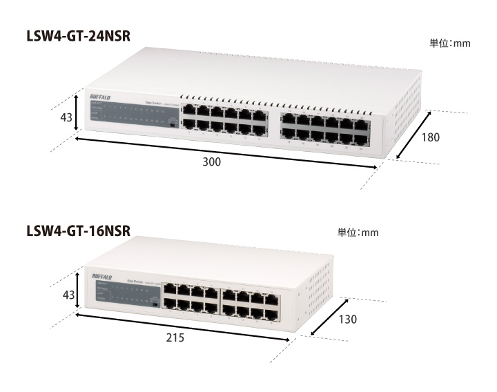| 外形寸法(幅×高さ×奥行) | LSW4-GT-24NSR:300×43×180mm LSW4-GT-16NSR:215×43×130mm ※本体のみ(突起部除く) |