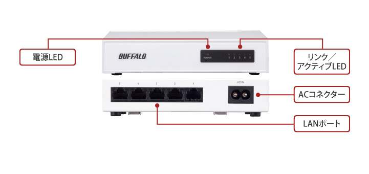 | サポート機能 | Auto-Negotiation (10/100/Half-Duplex)機能、Auto-MDIX機能、IEEE802.3x フローコントロール、バックプレッシャー機能サポート、不良パケットフィルタリング機能、おまかせ節電機能[リンク]、EAPOL(IEEE802.1X)フレーム透過、BPDUフレーム透過、アイドリングストップ機能(IEEE802.3az Energy Efficient Ethernet)対応 | |
