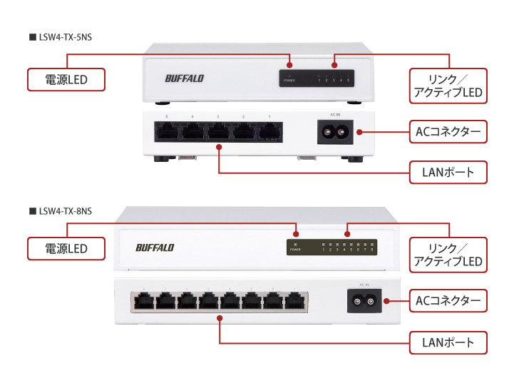 | ポート数 | LSW4-TX-8NS:8ポート LSW4-TX-5NS:5ポート |