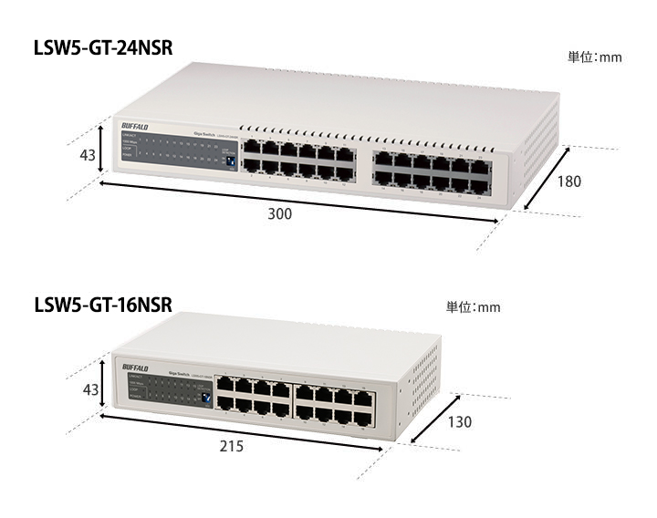 | 外形寸法(幅×高さ×奥行) | LSW5-GT-24NSR:300×43×180mm LSW5-GT-16NSR:215×43×130mm ※本体のみ(突起部除く) |