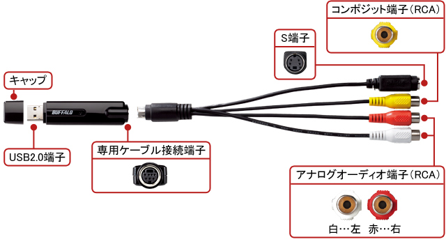 | 製品構成 | 本体 AVケーブル USB延長ケーブル(50cm) ユーティリティーCD(ドライバー、「VHS to DVD 2.5 SE」) マニュアル / 保証書 |