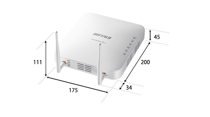 | サポート機能 | DFS障害回避機能、干渉波自動回避機能、電波環境見える化機能※1、リモート管理機能、電波出力調整、電波混雑防止機能、APSD、DTIM、Beacon Period、QoS、ロードバランス(接続台数制限)、MAC-RADIUS認証、内蔵RADIUSサーバー機能、Proxy ARP(プロキシ・アープ)機能 ※1 管理ソフト「WLS-ADT」(別売)が必要 |