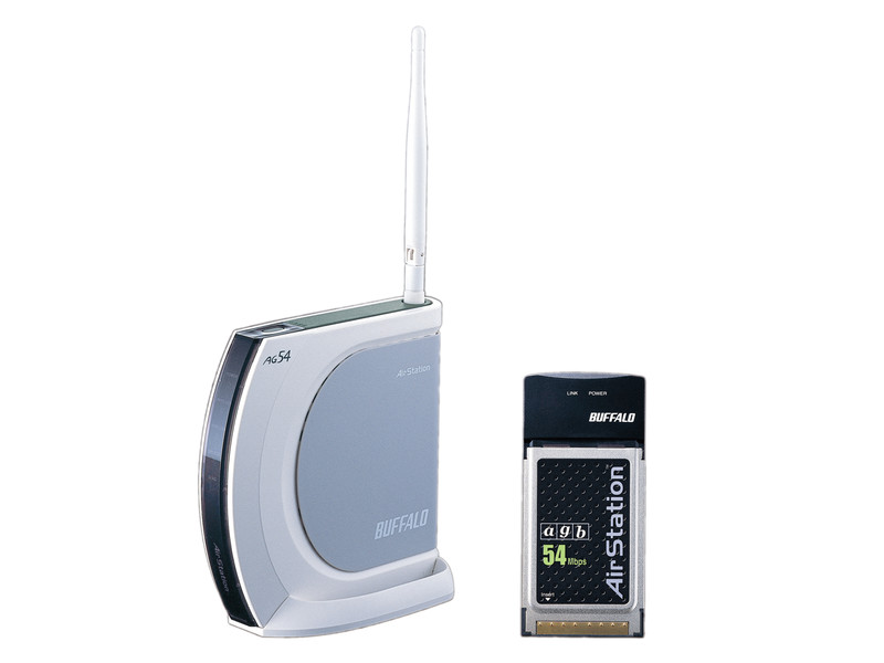 | 製品構成 | 無線LAN親機:WHR-AMPG-KD CardBus用 無線LAN子機:WLI-CB-AG-KD 縦置き用スタンド アンテナ LANケーブル(ストレート0.5m) ACアダプタ エアナビゲータCD(「エアナビゲータ」「クライアントマネージャ3」「クライアントマネージャV」、マニュアル) らくらく!セットアップシート / 保証書 |