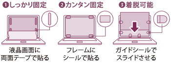 液晶画面に両面テープで貼る「しっかり固定」、フレームにシールで貼る「カンタン固定」、ガイドシールでスライドさせる「着脱可能」の3つから貼り方を選べます。