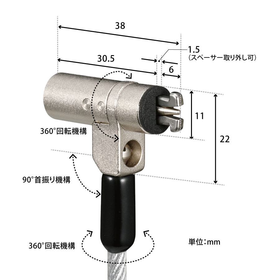 | 外形寸法 | ロック部 長さ 約38mm×径 約11mm(ワイヤーは除く※1)フック奥行 約6mm ワイヤー 長さ 約2000mm×径 約4.5mm ※1 ワイヤー接続部を含めると径11mm+11mm |