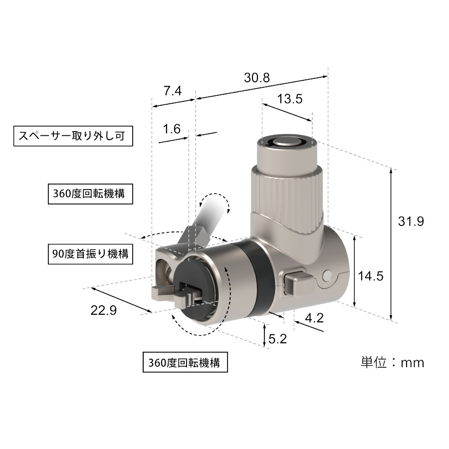 ワイヤーの取り回しがしやすい90度首振り機構を採用。