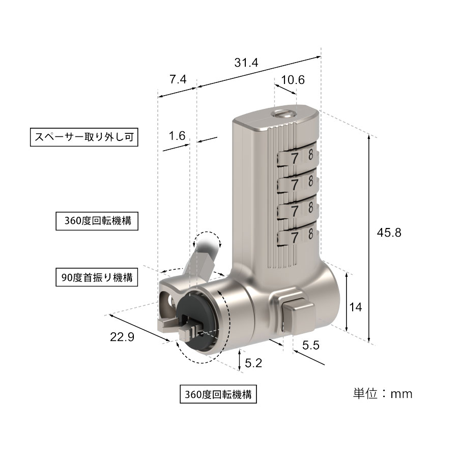 ワイヤーの取り回しがしやすい90度首振り機構を採用。