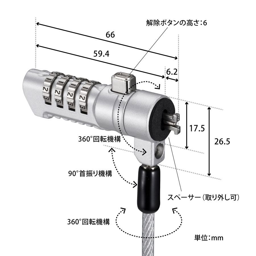 セキュリティースロットにセットし、パソコンや液晶モニター、外付けHDDなどを盗難から守るダイヤル錠タイプのワイヤーロックです。