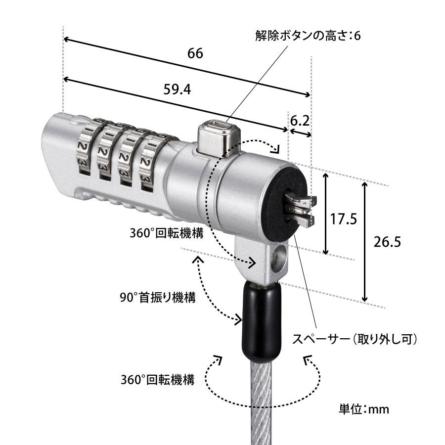 | 外形寸法 | ロック部 長さ 約66mm×径 約17.5mm(ワイヤーは除く※1)フック奥行 約6.2mm ワイヤー 長さ 約2000mm×径 約4.5mm ※1 ワイヤー接続部を含めると径17.5mm+9mm |