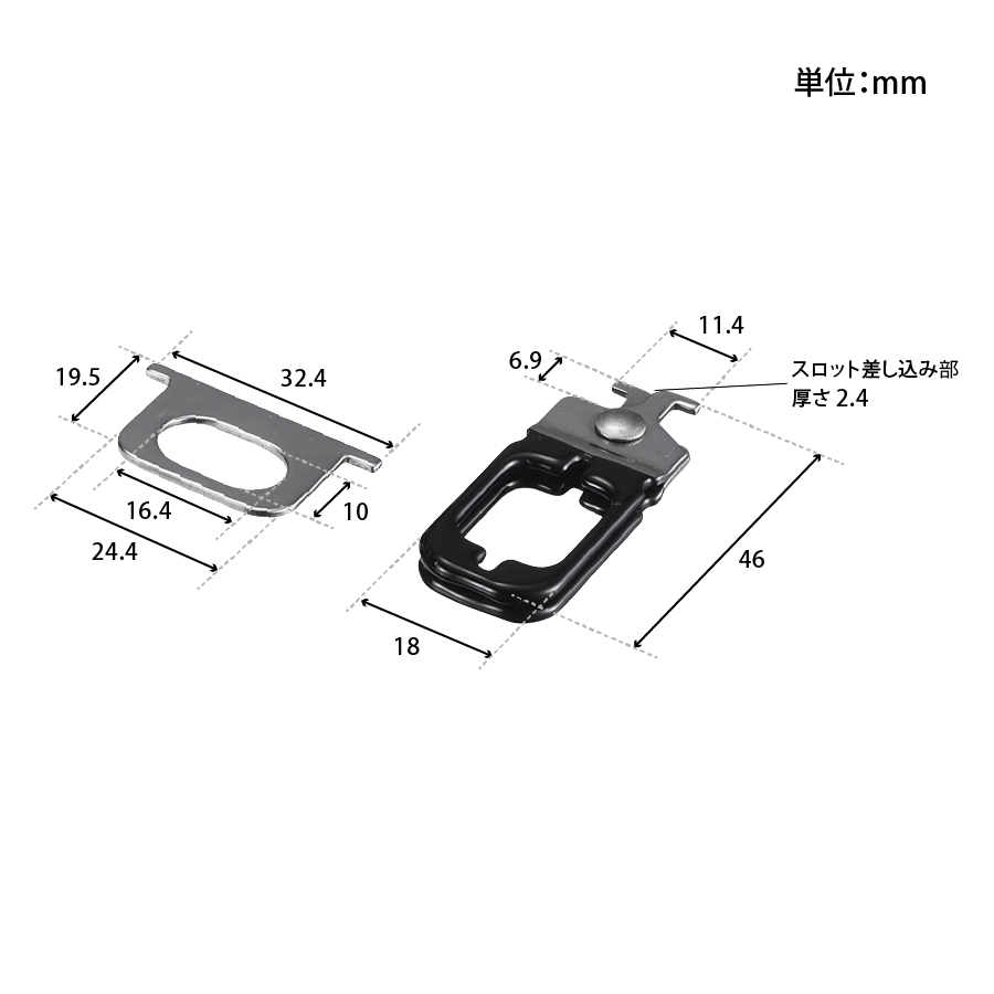 | 外形寸法 | 南京錠:W30mm×H68mm×D17mm ワイヤー:長さ1800mm 太さ2.2mm スロットパーツ:W18mm×H46mm×D2.4mm フック奥行 約6.9mm |