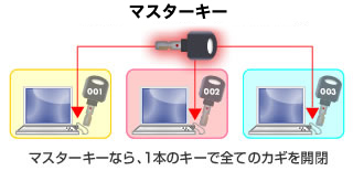 通常、パソコン使用者がキーを保管・管理する場合、異なるキーが複数必要です。統一キーモデル/マスターキーモデルなら、パソコン使用者はキーを持たず、管理者がキーを一括して保管・管理できます。