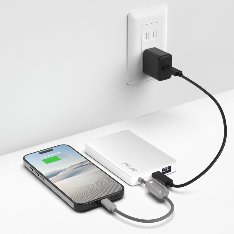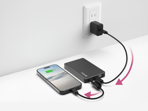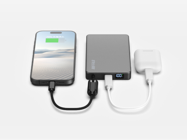 スマホを優先して充電し、完了後に自動で本商品を充電する「パススルー機能」を搭載。繋いでおくだけで、どちらも満充電で持ち出せます。