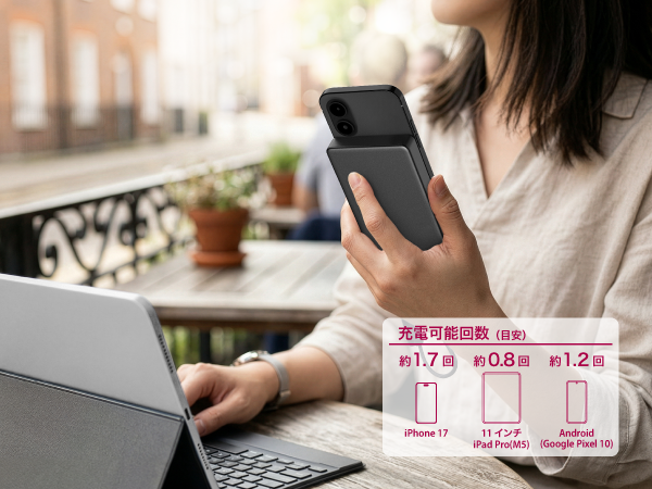 iPhone 17を約1.7回、11インチ iPad Pro(M5)を約0.8回、Google Pixel 10を約1.2回充電※できます。