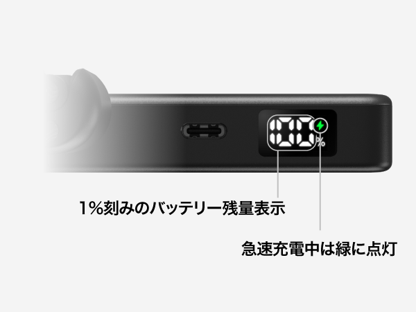 1%刻みでバッテリー残量を表示するLEDモニターを搭載。本商品の充電中は数字が点滅し、急速充電中は数字横のマークが緑に光ります。