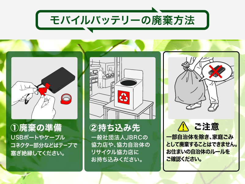 モバイルバッテリーを廃棄する際には、USBポートやケーブルのコネクター部分をテープ等で絶縁した上で、「小型充電式電池」のリサイクル活動を推進しているJBRCの協力店にお持ち込みください。