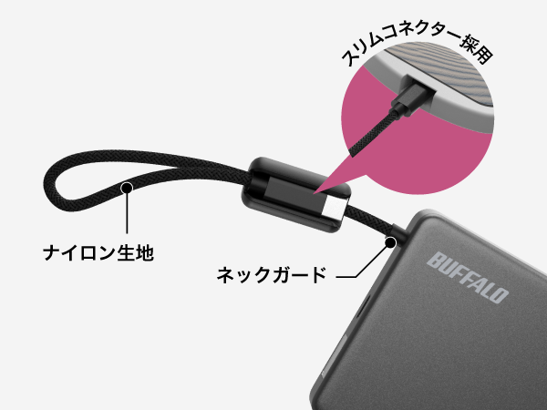 また、丈夫なナイロン生地とケーブル付け根のネックガードが、ケーブル断線により充電ができないトラブルを軽減します。