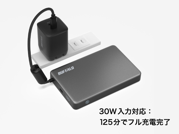 デバイスへの給電に加え、本商品自身も30Wでの高速充電が可能。限られた時間での充電にも便利にお使いいただけます。