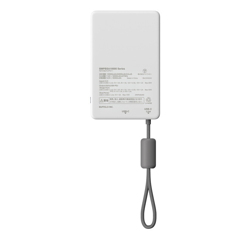 | 出力 | USB Type-C ×2 単ポート 最大30W USB PD…5V/3A、9V/3A、12V/2.5A、15V/2A ※2ポート同時出力時、合計15Wまで |