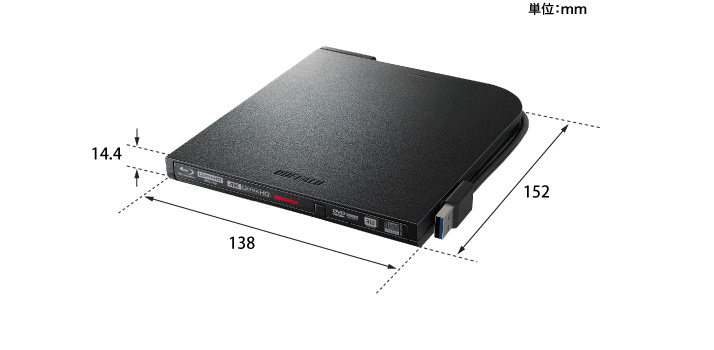 本商品は、9.5mm 厚ドライブを採用することで、旧機種BRXL-PC6U2と比べて約40g の軽量化を実現。 本体の厚さ14.4mm、重さ300g のスリムボディーなので持ち運びもスマート。最新のウルトラブックなど薄型のパソコンにもマッチします。