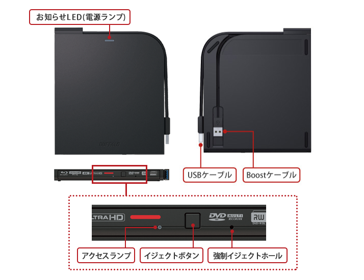 本商品は、必要なときにさっと接続して使えるポータブルブルーレイドライブです。USBケーブル1本をパソコンにつなぐだけで手軽にご利用いただけます※。本商品ではさらに、パソコンのUSBポートからのバスパワー(電力供給)が不足した際に発生していたブルーレイドライブの不安定な動作を解消するための二つの機能を搭載。 電力不足を光で伝える「お知らせLED」と電力不足を専用のケーブルで補える「Boost(ブースト)ケーブル」の搭載で、今までACアダプターがないと使用できなかったパソコンでもブルーレイドライブの使用が可能になりました。