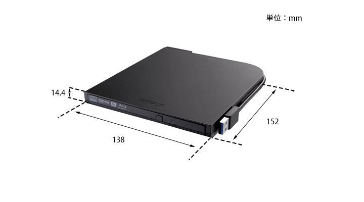 本商品は、9.5mm 厚ドライブを採用することで、従来機種BRXL-PC6U2と比べて約120g の軽量化を実現。 本体の厚さ14.4mm、重さ220g のスリムボディーなので持ち運びもスマート。最新のウルトラブックなど薄型のパソコンにもマッチします。