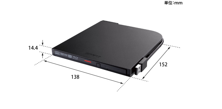 本商品は、9.5mm 厚ドライブを採用することで、従来機種BRXL-PC6U2と比べて約47g の軽量化を実現。 本体の厚さ14.4mm、重さ293g のスリムボディーなので持ち運びもスマート。最新のウルトラブックなど薄型のパソコンにもマッチします。