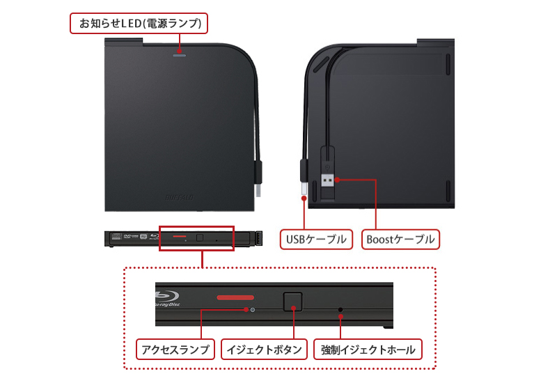 | 主な付属品 | F字USBケーブル(本体装備済み、USB側 26cm/給電側 23cm)、ユーティリティーCD-ROM(簡単セットアップ、ソフトウェア(Power2Go))、マニュアル、Adobe Reader)、 取扱説明書 ※添付のソフトウェアは、製品を使用するパソコン1台にのみインストールできます。 |