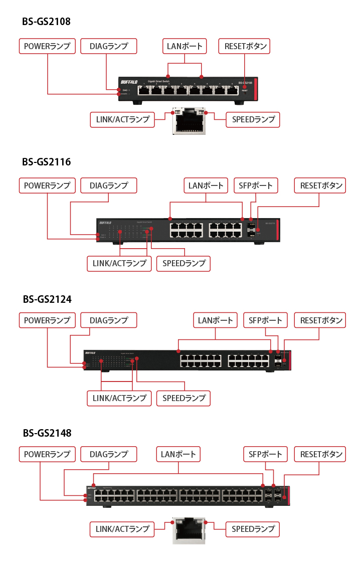 | ポート数 | BS-GS2148:10/100/1000M 48ポート(全ポートAuto-MDIX機能搭載)+SFP4ポート BS-GS2124:10/100/1000M 24ポート(全ポートAuto-MDIX機能搭載)+SFP2ポート BS-GS2116:10/100/1000M 16ポート(全ポートAuto-MDIX機能搭載)+SFP2ポート BS-GS2108:10/100/1000M 8ポート(全ポートAuto-MDIX機能搭載) |