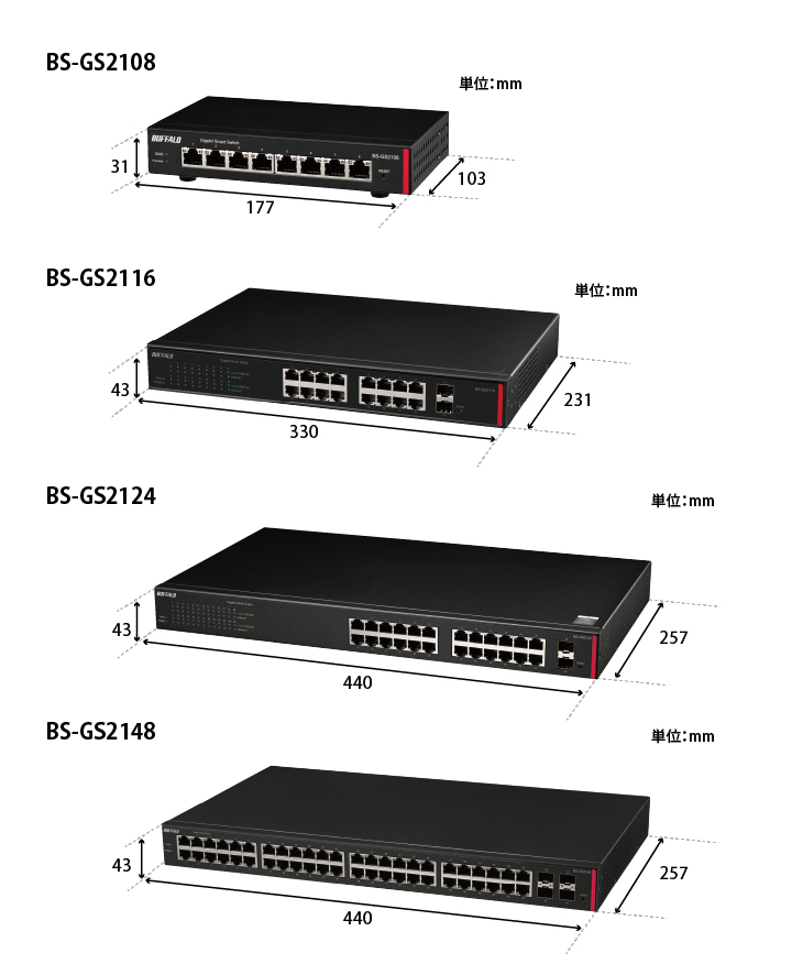 | 外形寸法(幅×高さ×奥行) | BS-GS2148:440×43×257mm BS-GS2124:440×43×257mm BS-GS2116:330×43×231mm BS-GS2108:177×31×103mm |