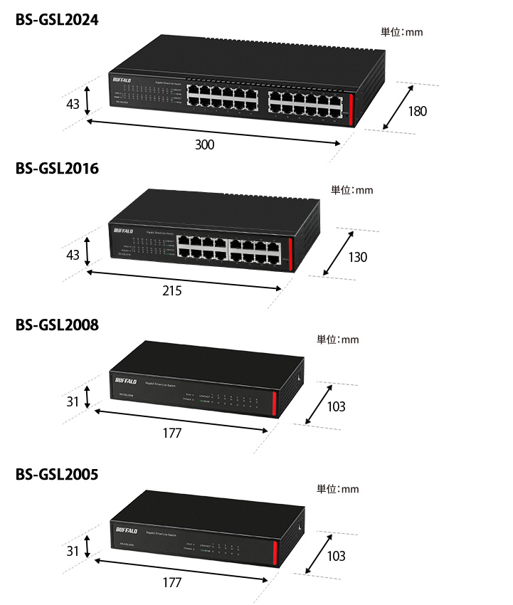 | 消費電力 | BS-GSL2005:最大2.9W BS-GSL2008:最大3.9W BS-GSL2016:最大9.4W BS-GSL2024:最大12.7W |