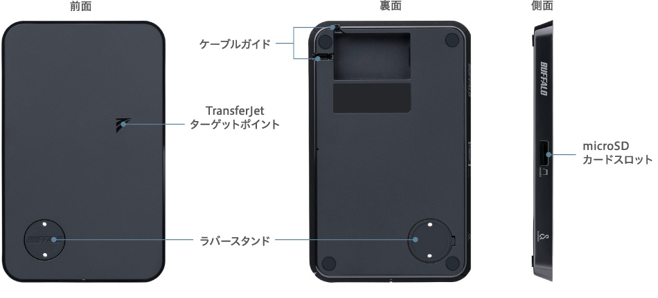 本体からはみ出しても取り外しが可能なラバースタンドでTransferJetの安定通信を実現します。