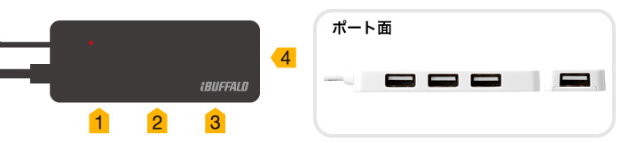 正面に3ポート、側面に1ポートを配置。接続したままで使用するUSB機器を正面に、よく抜き挿しするUSB機器を側面の1ポートに接続するなど使い分けが可能です。USBメモリー等は側面の1ポートに接続すると、他のポートに干渉せず抜き挿しできて便利です。