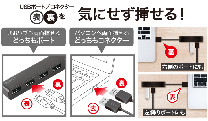 PCに繋ぐときも、USBハブにマウス・キーボードなどを繋ぐ時も、どっちもらくらく接続できる。「どっちもUSBコネクター」&「どっちもUSBポート」の両機能を搭載した"どっちもUSBハブ"です。