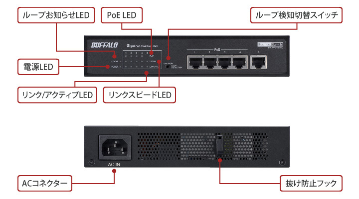 | PoE給電機能 | 各ポート:最大15.4W、最大供給電力 40W | |
