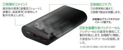 使用時の過電流(ショート)/過電圧などの異常を検知して動作を停止しスマホを保護する2段階の回路、安全装置付のバッテリーセルを搭載。安心・安全な充電が行えます。