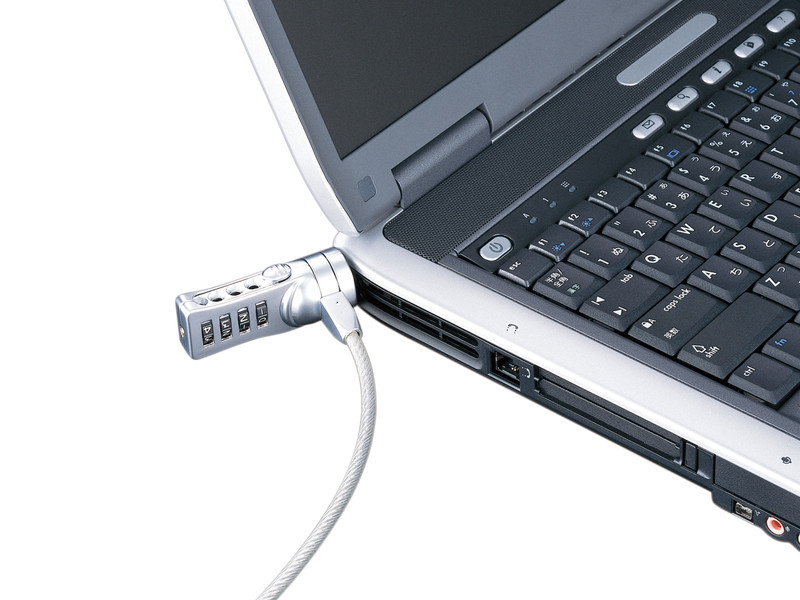 パソコン、液晶ディスプレイ等のセキュリティスロットに挿して、ダイヤルを回すだけ。 ダイヤルロックの暗証番号(4桁)は、好きな番号に設定可能。