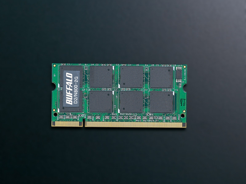 現在、世界で出荷されているパソコンの大半に使用されているDDR1、DDR2メモリーモジュール。これにはバッファローが標準化に貢献した基板が採用されています。