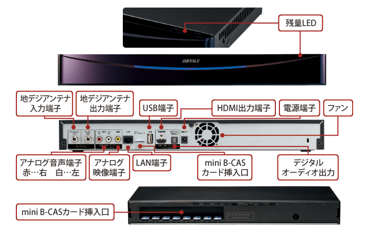 | 出力 | アナログ映像端子(1系統) アナログ音声端子(1系統・ステレオ2ch) デジタルオーディオ出力端子(光角型) HDMI出力端子(1系統) 地上デジタルアンテナスルー出力端子×1系統 |