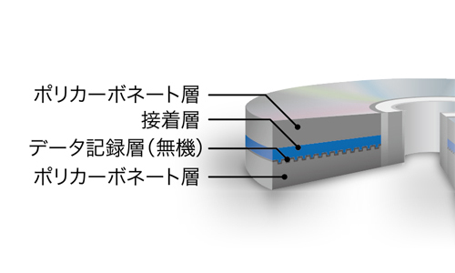 M-DISCは無機質系素材の記録層にレーザーでデータを焼き込む方式を採用した記録メディアです。無機質系素材を使用することにより、高温、多湿、太陽光等の影響を受けにくく、長期間の記録保持が可能です。