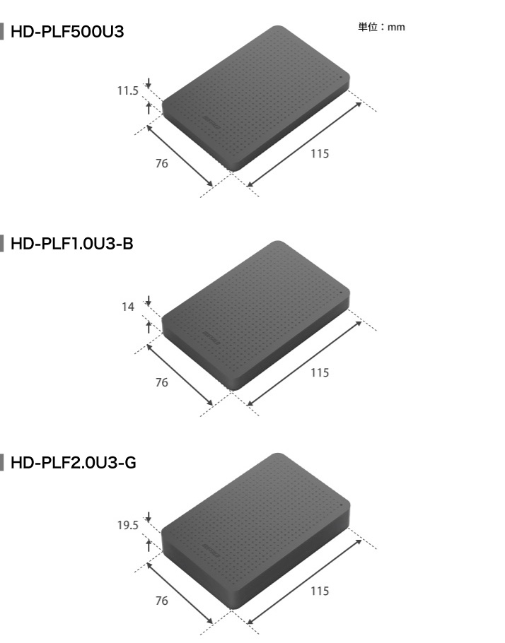 | 搭載ドライブ | HD-PLF2.0U3-GB:2TB HD-PLF1.0U3-BB:1TB HD-PLF1.0U3-BW:1TB HD-PLF500U3-B:500GB HD-PLF500U3-W:500GB |