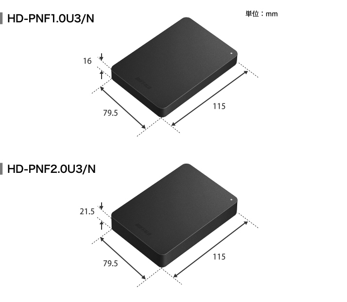 | 搭載ドライブ | HD-PNF2.0U3-GB/N:2TB HD-PNF1.0U3-BR/N:1TB HD-PNF1.0U3-BB/N:1TB HD-PNF1.0U3-BL/N:1TB |