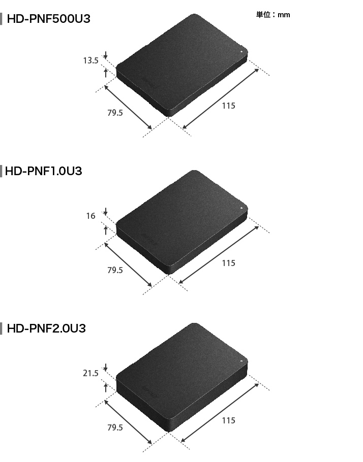 | 搭載ドライブ | HD-PNF2.0U3-GB:2TB HD-PNF1.0U3-BR:1TB HD-PNF1.0U3-BB:1TB HD-PNF1.0U3-BL:1TB HD-PNF1.0U3-BP:1TB HD-PNF1.0U3-BW:1TB HD-PNF1.0U3-BY:1TB HD-PNF500U3-B:500GB |